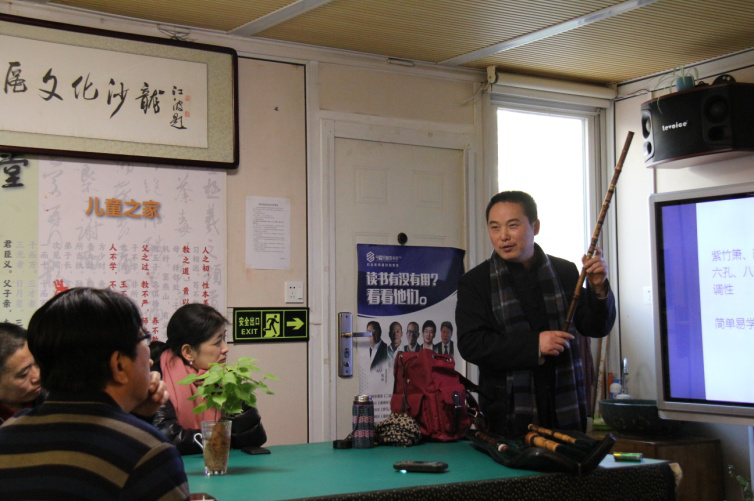 接下来,王瑞昌老师讲解中国传统乐器——洞箫,让居民们从中体会中国的传统乐器的魅力。王瑞昌老师先向社区群众介绍了关于洞箫的传说,并从诗词角度出发,来加深对于箫的了解,紧接着,讲解了一些关于箫的种类,孔数,调性等基本知识以及箫曲的个性,如箫曲所表达出的高洁逍遥,凄怆,坚劲,明丽等情感。最后,王瑞昌老师为大家现场演奏了《梅花三弄》、《阳关三叠》、《平沙落雁》、《苏武牧羊》等洞箫古曲。在讲解的过程中,王瑞昌老师积极与大家交流,激发大家的学习兴趣,努力让更多的人感受到中国传统乐器的魅力。