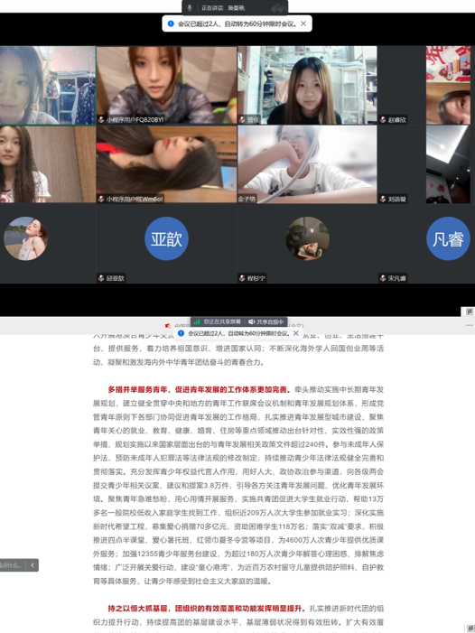2022级新闻传播学4班团支书施曼琳认为:通过本次由班级团支部组织的线上团十九大学习,我们对中国共青团的历史和使命有了更加清楚、深刻的认识。同时,对于习近平新时代中国特色社会主义思想有了更深入的了解,相关知识和见解有了很大的提升和丰富。另外,我们还在学习中再一次强调了党的二十大精神,明确了坚定理想信念,牢记历史使命,坚定不移地前进的精神。最后,我们还学习了“青年汇智团”等青年民主协商和建言渠道,从而提高我们对民主实践的参与度,用鲜亮的青春书写华丽的新篇章。