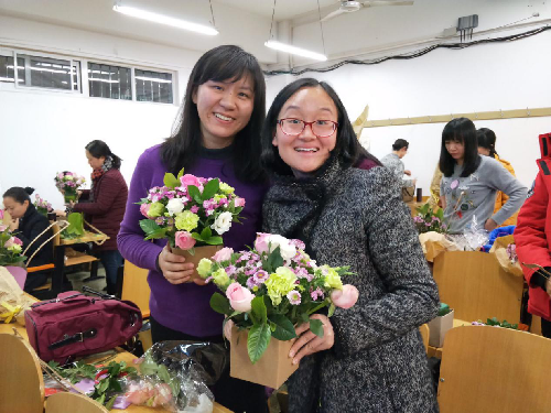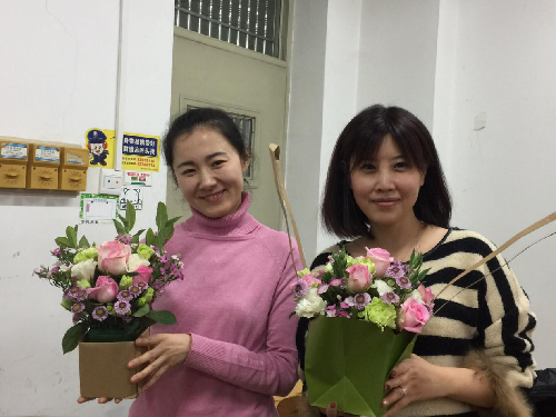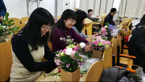 接下来插花环节,花艺师通过ppt,生动形象地给大家讲解了插花的概念、插花的艺术风格、花材花语、鲜花保养和桌花制作的相关知识。随后,老师们在花艺师指导下制作小花篮。她们巧妙构思,精心修剪花材,小心翼翼插枝造型。形态各异的花篮,展示了不同的审美情趣和追求,其中实验中心的郭兴华老师和广告学系许敏玉等两位老师的作品,得到了大家的交口称赞。花美人更美,一组组姊妹花造型的照片,呈现出一幅幅人面鲜花相映红的图景;大合影中,手捧鲜花的美丽女神们围着可爱的“绿叶”——石院长笑逐颜开。一个多小时的时间不知不觉过去了,大家带着自己的得意之作和满满的幸福,踏上归途。