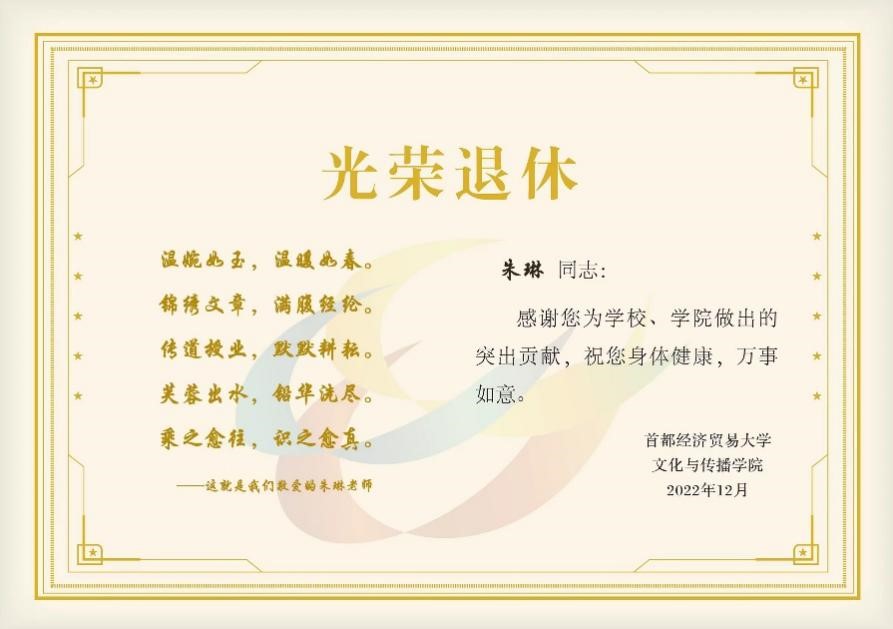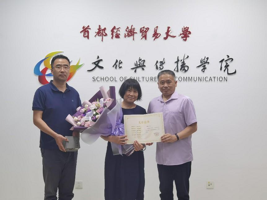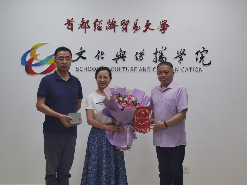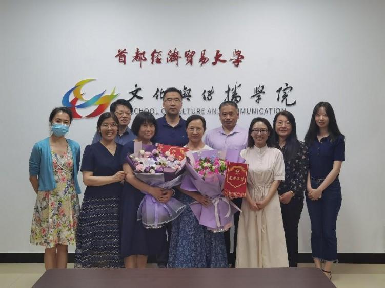 朱琳老师、杨景越老师于2022年荣退,两位老师在首经贸、在文传学院工作、生活了数十载时光。首先,学院党总支书记石刚代表全体教职工对两位老师在学院发展、学生成长成才中做出的奉献表达了深深地感谢,并祝愿她们拥有一个健康快乐、充实幸福的退休生活。接下来,党总支书记石刚和院长于九涛向两位教师赠送了学院精心设计制作的“光荣退休卡”,贺卡里一词一句满是学院对两位教师好学修身、勤勉敬业、尽善尽美的精神品质的赞美,和为教育事业热忱辛勤付出的敬意与感谢。