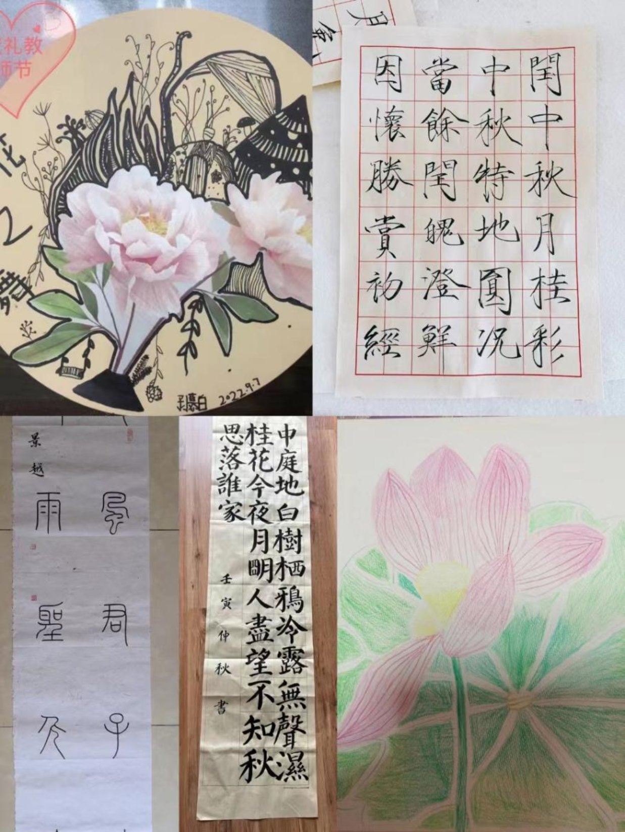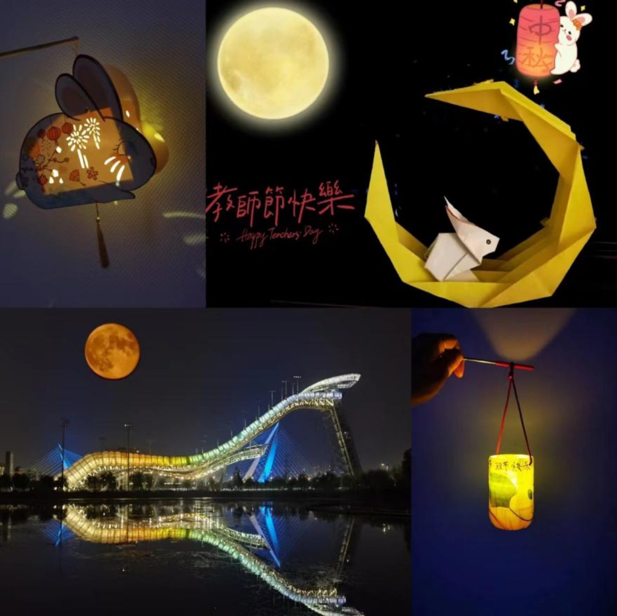 活动中,有的老师全家齐上阵,制作了创意与美味并存的月饼;有的老师巧手diy,制作了精美的中秋花灯、玉兔折纸;还有的老师寄情山水之间,或外出登高,或品茗作诗、挥毫泼墨,值此秋高气爽之际,快意人生!虽不在一地,但天涯共此时,在学院群中,老师们通过图片、视频的形式互相传递着中秋节和教师节的思念与祝福,使节日的气氛更显浓厚。