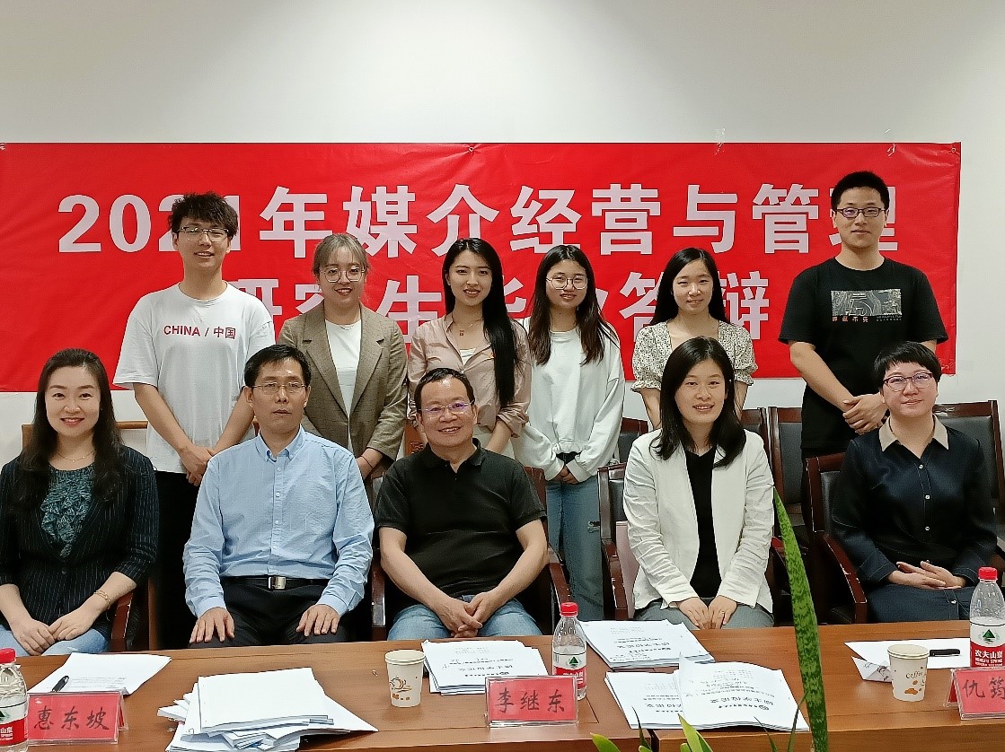为保证2018级媒介经营与管理这一跨学科硕士学位点毕业论文答辩的质量与规范,文传学院特别邀请中国传媒大学传播研究院副院长、教育部社科人文重点研究基地中国传媒大学国家传播创新研究中心副主任、博士生导师李继东教授担任答辩委员会主席,邀请北京联合大学惠东坡教授、中国传媒大学仇筠茜副教授、北京交通大学董媛媛副教授、北京城市学院范松楠副教授,组成阵容强大的毕业论文答辩委员会。除此之外,出席毕业论文答辩的还有文传学院石刚院长、郭媛媛、郑文明教授和贺心颖、徐轶瑛副教授,科研秘书郭锦鹏老师,以及部分2019、2020级新闻传播学硕士研究生。