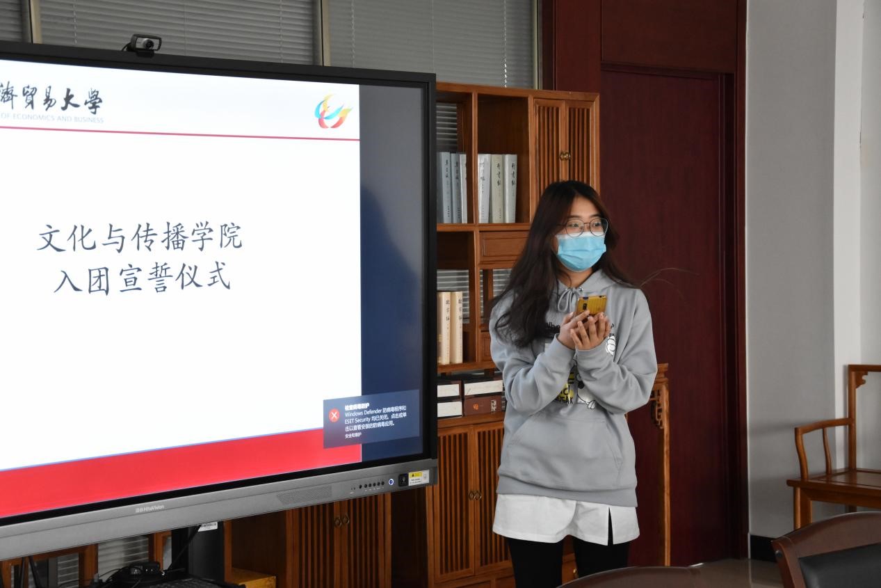 首先,由侯子怡宣布新团员名单:18级传播学一班张公泽和19级传播学三班董李,光荣地加入了中国共产主义青年团。