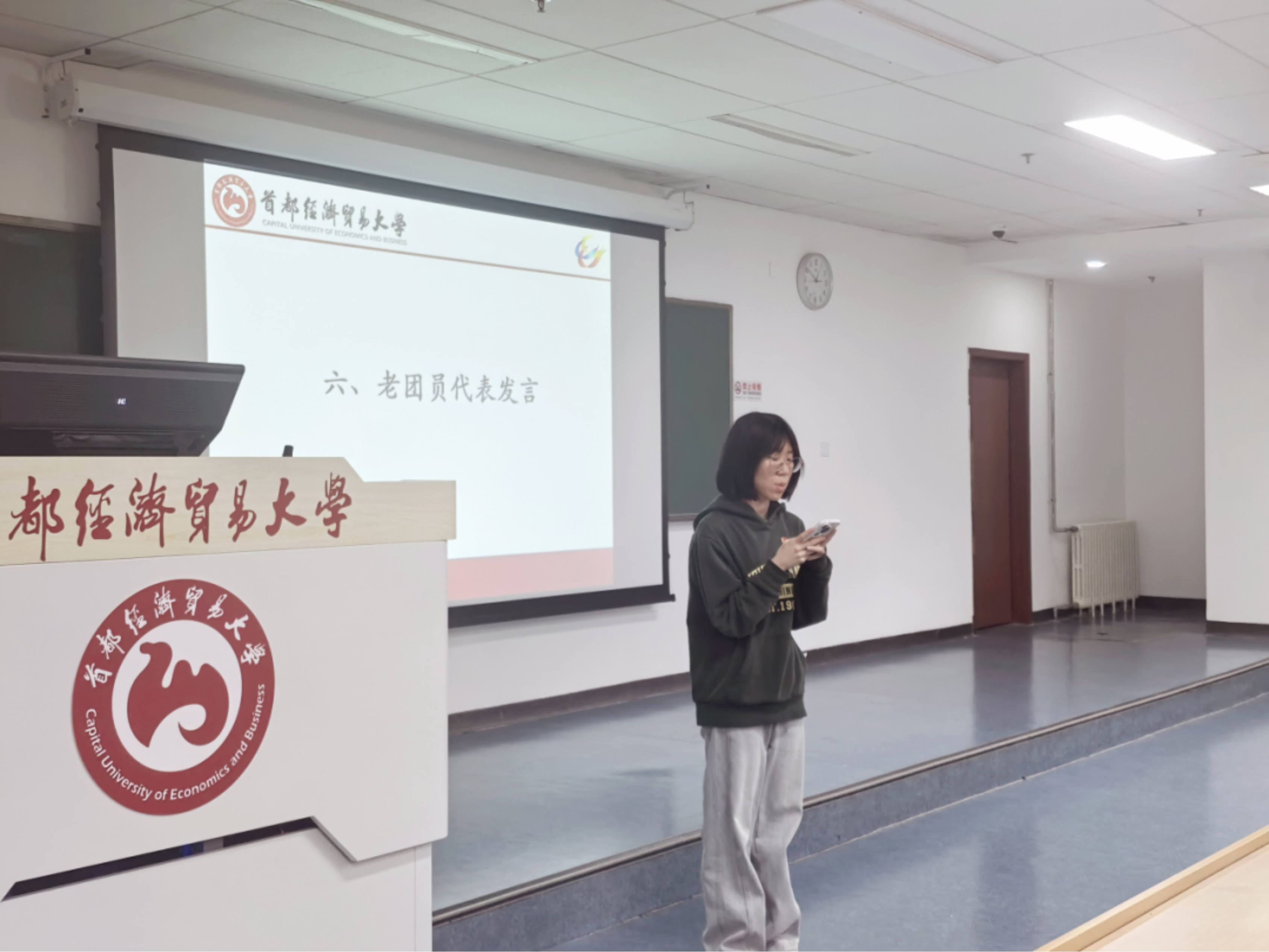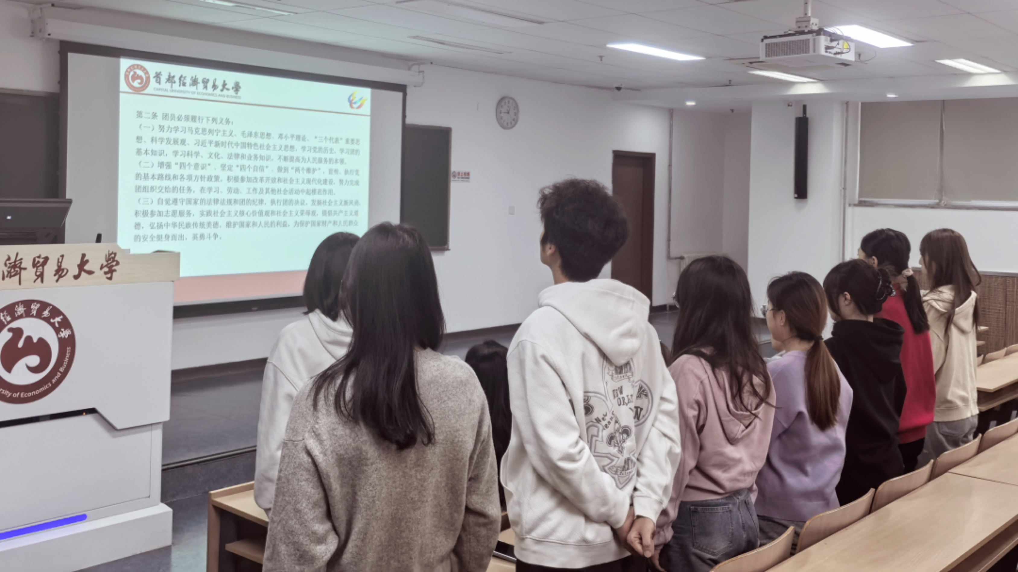 武若涵引领全体新发展团员一同学习了《团章》中的节选内容。随后,高慧莹、杨轶如作为新团员代表进行了发言。她们表示,成为团员既是荣耀,更是沉甸甸的责任,未来将持续以优秀团员的标准要求自己,勤学锤炼、增长才干,在校园发挥先锋作用,在社会实践中践初心,用青春诠释“永远跟党走”的理想信念。闻雨轩作为老团员代表上台发言。她充分结合自身在团组织中的成长经历,勉励新团员将个人理想融入国家和社会发展,在实践中锤炼本领,努力成长为有理想、敢担当、能吃苦、肯奋斗的新时代优秀青年。