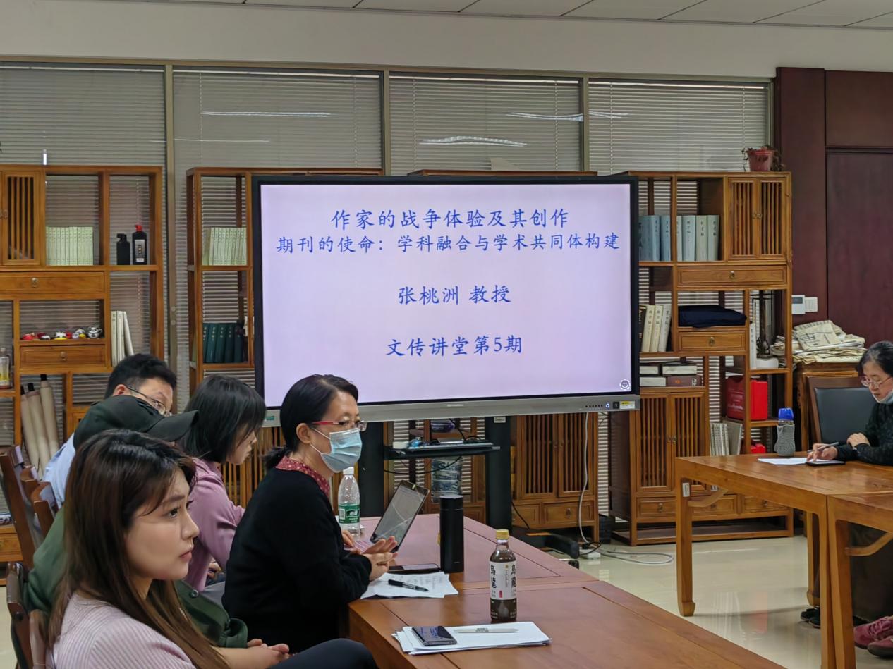 2024年5月8日上午,老王磁力 在博远楼506举办“文传讲堂”系列活动第五场讲座,本次“文传讲堂”邀请《首都师范大学学报》(社科版)主编,首都师范大学文学院教授、博士生导师,中国诗歌研究中心专职研究员张桃洲教授进行学术讲座,讲座主题分上下半场,上半场主题为“作家的战争体验及其创作”,下半场主题为“期刊的使命:学科融合与学术共同体构建”。老王磁力 院长于九涛、副院长许敏玉以及学院教师、研究生代表共同参加本次讲座。讲座由许敏玉主持。