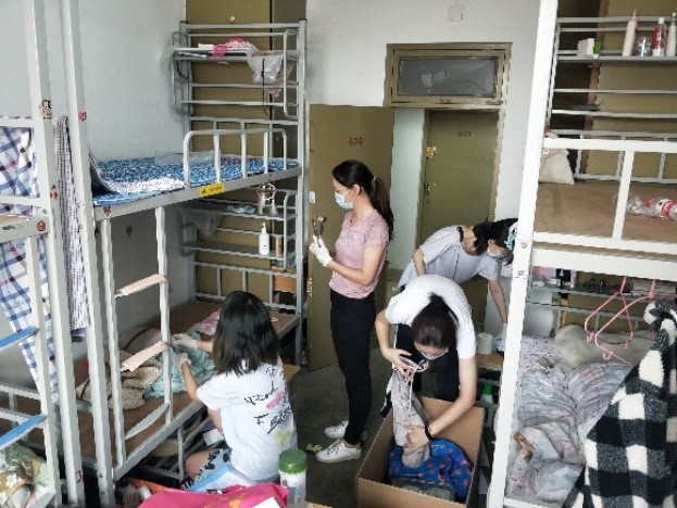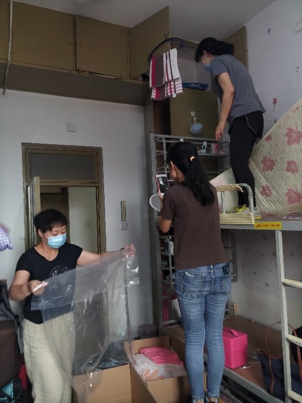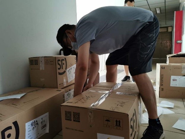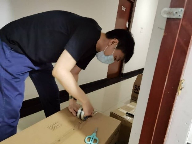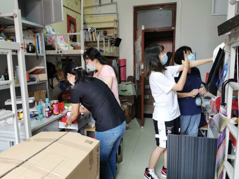 7月7日,学院作为第一批毕业生入校及行李收整邮寄工作的试点单位,院班子成员、全体行政人员和教师党支部书记、教师党员志愿者率先走进宿舍,踩高俯身,撸起袖子、铆足了劲,帮助毕业生们进行行李物品的收整和邮寄工作。从早上9点到晚上7点,除了半个小时的午餐时间,没有片刻休息。“我们这边任务完成了,过去帮你们吧!”“上午打包行李总结了一些经验,和大家分享……”“大家下午加油!”终于,在学校各部门的协助下,在老师们的共同努力与相互配合下,顺利完成了学院第一批毕业生入校行李收整和邮寄工作,并积累了相关工作经验。