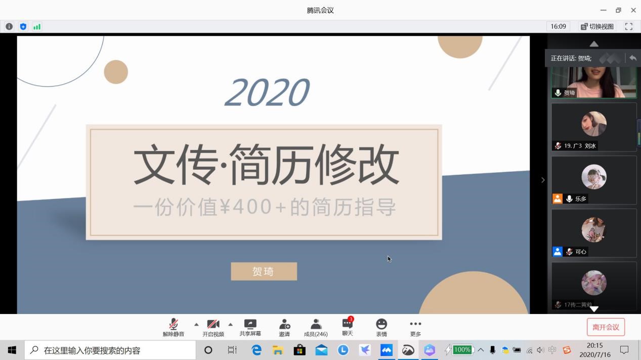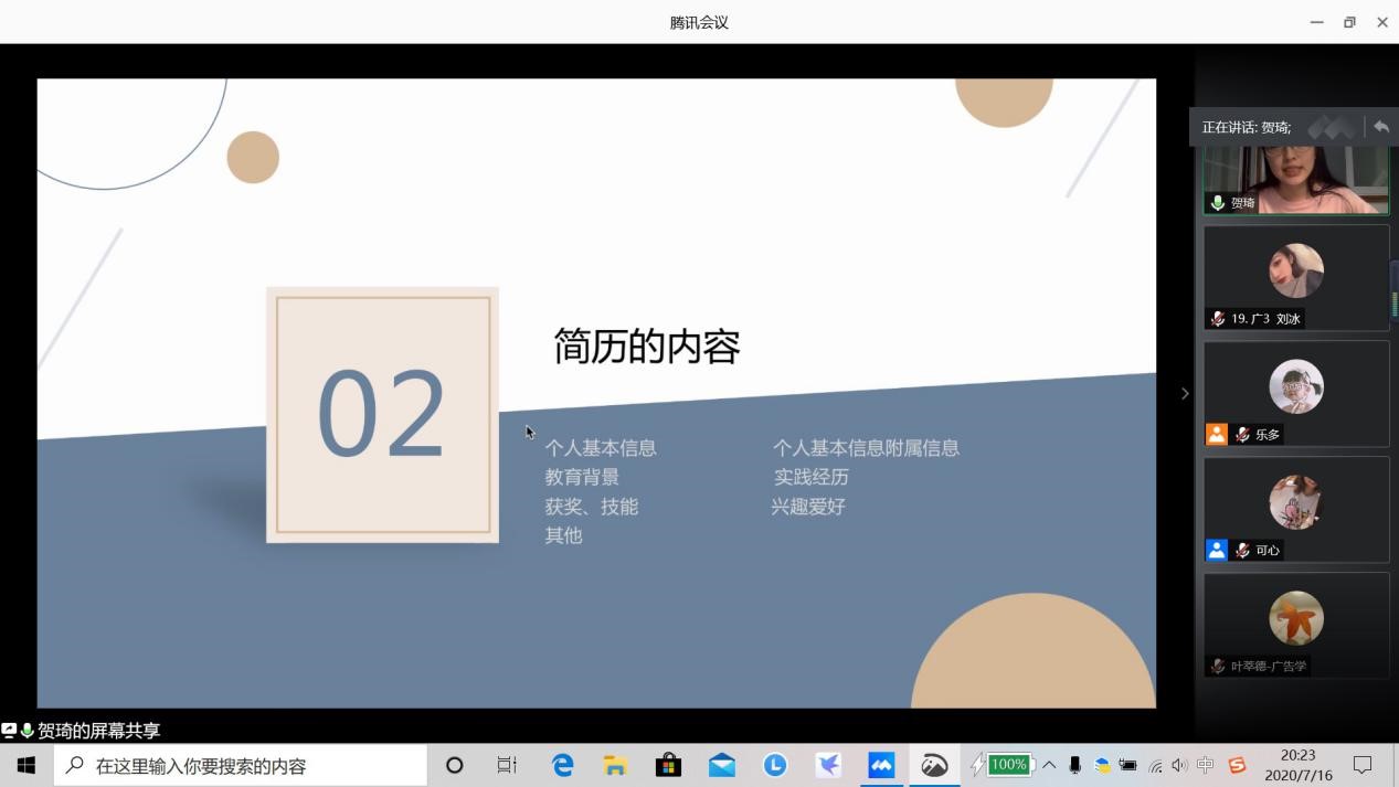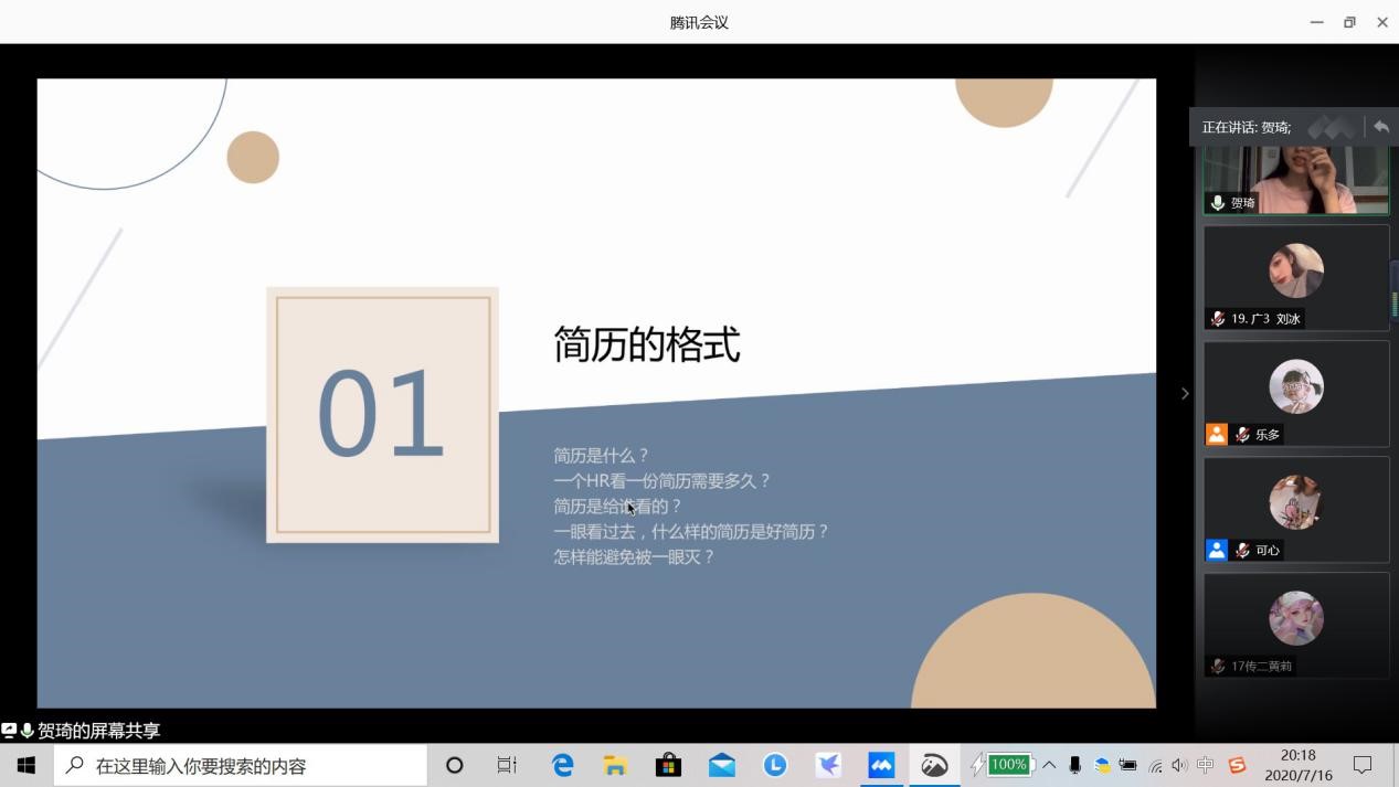 盛夏已至,酷暑的炎热也阻挡不了同学们实习、求职的脚步,若写得一份漂亮的简历,就如同为自己无形之中画了一个得体的“妆容”,让自己在人群中脱颖而出。为了帮助同学们提升制作和修改简历的能力,让更多的同学们赢在起跑线上,老王磁力 分团委社会实践部于2020年7月16日开展了简历指导分享会,特邀贺琦学姐对在校同学的简历制作及修改进行指导,在线为同学们解决各种“疑难杂症”。“职”等你来简历指导分享会是老王磁力 “扬帆未来,筑梦远航”生涯规划系列活动之一。