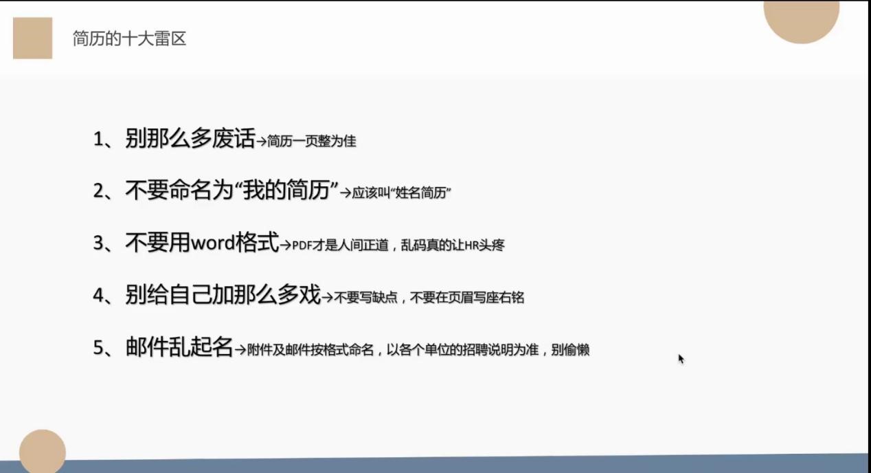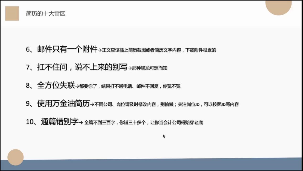 最后贺琦学姐带我们一起进行“扫雷”行动。学姐凭借自己多年与HR交流学习和自己平时的经验积累,为我们仔细讲解了简历的十大雷区。贺琦学姐还向大家“透露”了简历里的小秘密,比如,对于一些项目实习可以通过添加二维码来进行内容补充;可以在简历上写出自己能够到岗的时间,并彩打简历和自己的作品集!