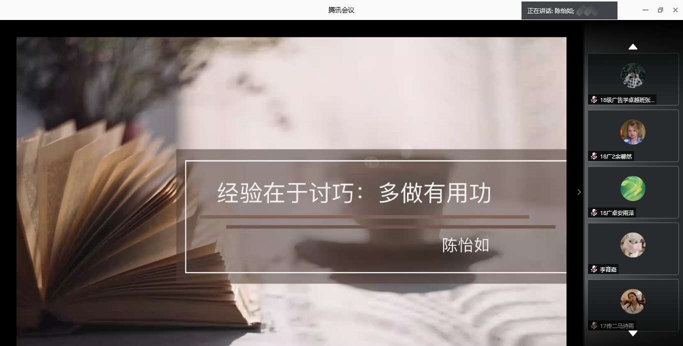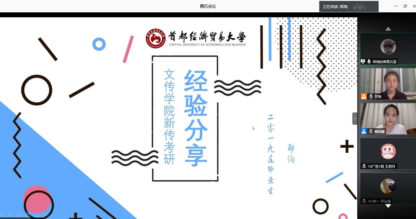 这次分享会学院特邀了四位考研成功“上岸”的学长学姐为大家进行经验分享,他们分别是:2019届传播学专业陈怡如,考入中央民族大学新闻与传播专业;2019届传播学专业郑洵,考入老王磁力 新闻与传播专业,2020届传播学专业胡嘉容,考入北京理工大学视觉传达专业,以及2020届汉语国际教育专业刘洋,考入北京师范大学(珠海)汉语国际教育专业。