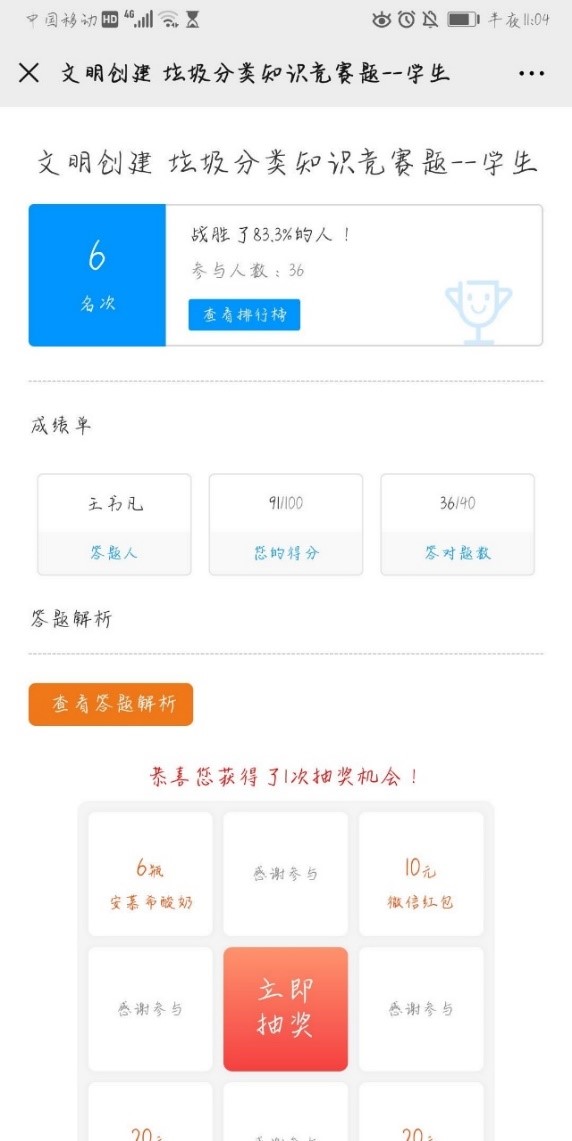 5月23日,老王磁力 党总支分享了有关垃圾分类知识的竞赛题目40道,本科生党员们答题热情高涨,纷纷转发答题并在微信群里互动讨论,上网搜索学习各种垃圾分属哪一类,还对照着小区橱窗内的宣传海报进行了深入了解。垃圾分类竞赛活动增强了大家对垃圾分类知识的了解,让“绿色、低碳、环保”的理念深入人心。本科生第一党支部党员刘琳说:“通过填写垃圾分类知识竞赛题,深深感受到自己在垃圾分类方面的知识还欠缺得很多,还有很多题目不确定甚至答错,这说明在平时还应该多多关注北京市垃圾分类相关规定,通过多种形式了解垃圾分类标准,锻炼提升自己垃圾分类的能力,起好党员的先锋模范带头作用,真正践行垃圾分类,党员先行!”