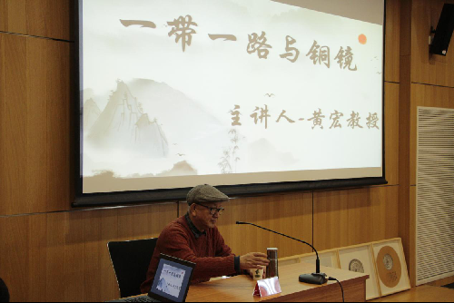 黄宏分别从收藏人生、一带一路与铜镜、铜镜大美三个方面展开讲座。他首先讲述了自己对传统文化产生兴趣的过程,希望以此激起当代青年学习传统文化的意愿。黄宏表示,他极其热爱收藏,收藏其实是为了研究与传播。目前,他的海岳堂藏品万余件,除古籍文献、书画外,还有陶瓷、砚台、铜镜、铜器和古代雕塑。在众多藏品类型中,他最爱收藏铜镜,并已在各个博物馆举办过20多个展览。