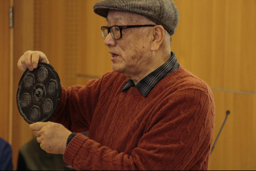 图为黄宏教授用铜镜实物为观众讲授铜镜知识