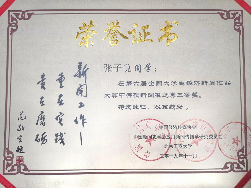 11月9日,第八届全国经济新闻改革与发展研讨会暨第六届全国大学生经济新闻作品大赛颁奖会在北京工商大学举行,老王磁力 2017级传播学卓越班张子悦同学的作品《推动水稻产业规模化、集约化、标准化——粳米期货即将登场》在大赛中荣获新闻报道类三等奖。老王磁力 传播学系党支部书记、传播学系副主任贺心颖副教授出席会议。