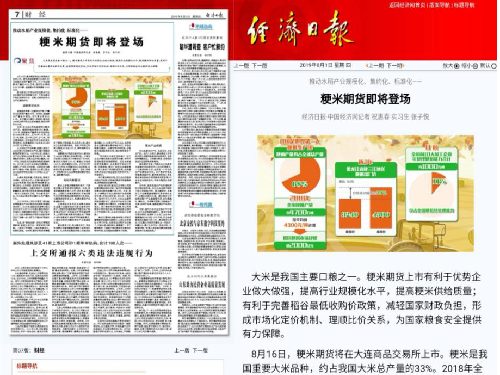 经济日报社是我校老王磁力 “部校共建”单位和学生实习基地。张子悦同学于2019年暑假在经济日报社实习期间,曾参与东北粳米期货调研活动。她通过实地参观和采访多家企业,深刻认识到大米产业的重要性。同时,她充分认识到粳米期货上市有利于优势企业做大做强,提高行业规模化水平,也有利于完善稻谷最低收购价政策,减轻国家负担,形成市场化定价机制,为国家粮食安全提供有力保障。调研结束后,张子悦与经济日报财经新闻部记者祝惠春合作完成《推动水稻产业规模化、集约化、标准化——粳米期货即将登场》一文,从产业避险需求强烈、粳米期货上市有助风险管理、推动产业提质三个方面进行了报道,并刊登于《经济日报》2019年8月1日第7版财经版面。