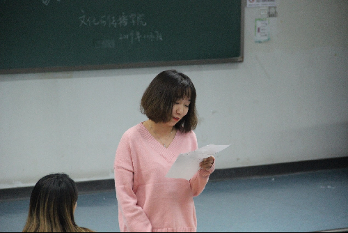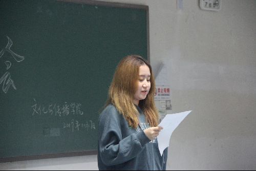 大会第二项学生代表发言。传播三班的魏泽琳同学以军训究竟创造了怎么样的回忆为主题,带大家回忆了属于六连女生军训时的艰辛且美好的回忆。对魏同来说这次的军训生活是珍贵满足的,大家给予了热烈的掌声以表示同意。