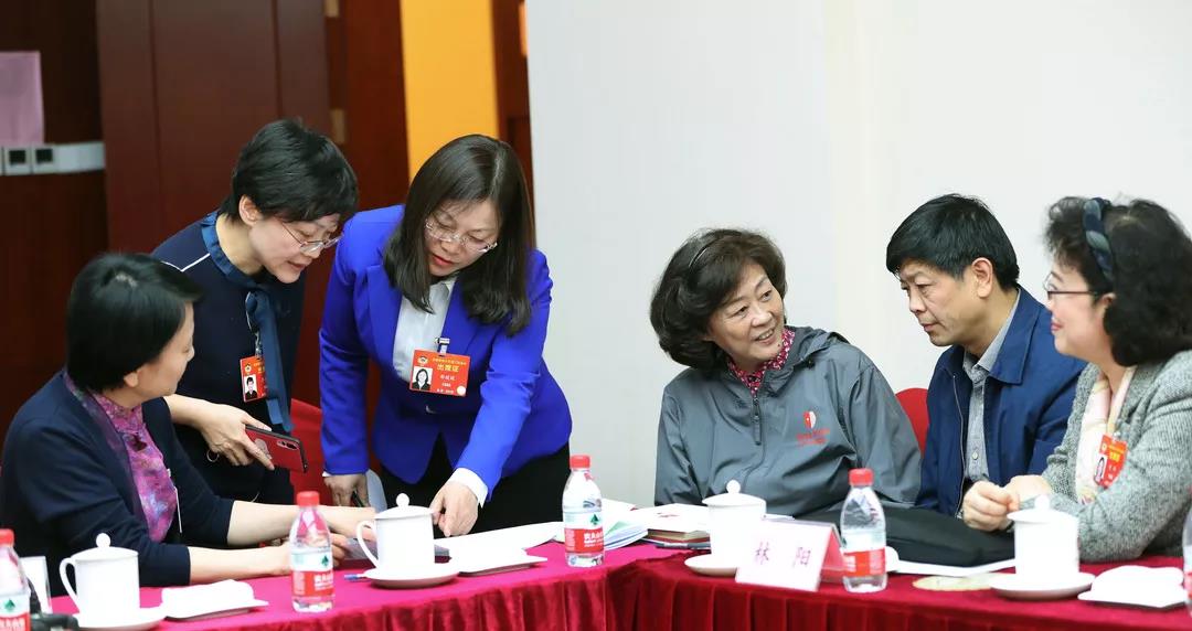 郭媛媛(左三)同与会代表讨论提案
