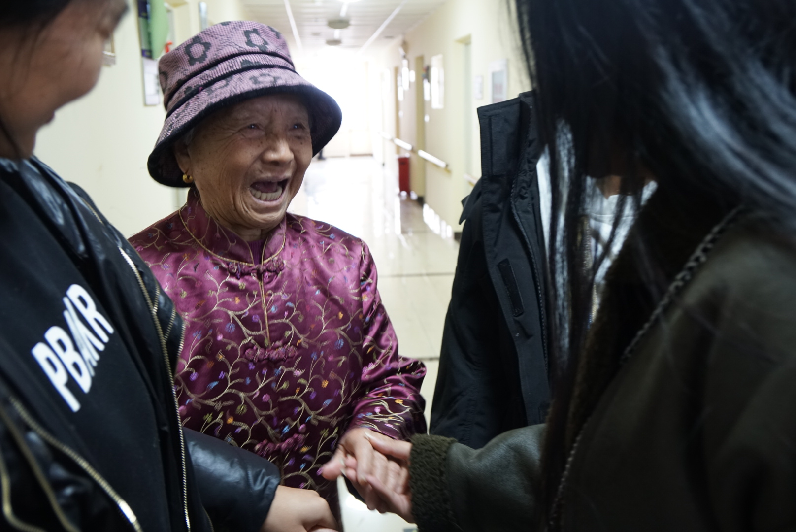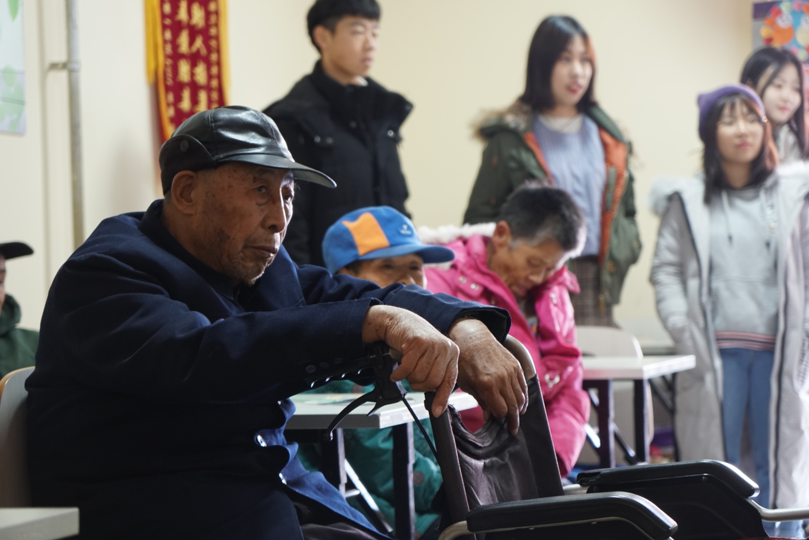 学生们并没有等多久,老人就陆陆续续的出来了。他们三三两两的坐在大厅周围的椅子上,而学生则站在另一端。这时,在大厅里汇聚的两方人,隔着时光的沟壑,好奇的互相对视着。