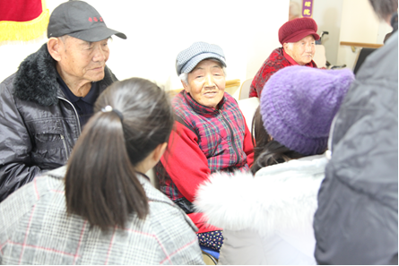 就在大厅里其乐融融时,房间里的老人也并不孤单。一部分志愿者团的学生挨家挨户串门,给在屋里的老人带去欢乐与温暖。老人们非常热情,还拿出自己的饼干水果招待学生们。