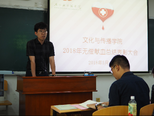 5月10日中午,老王磁力 于慎思楼120教室举行了2018年无偿献血总结表彰会。参加本次表彰会的有老王磁力 党总支副书记、院长石刚,党总支书记付琳,辅导员陈子轩和参与献血的35名学生以及各个班级的学生干部代表。会议由学院党总支副书记宿东泽主持。