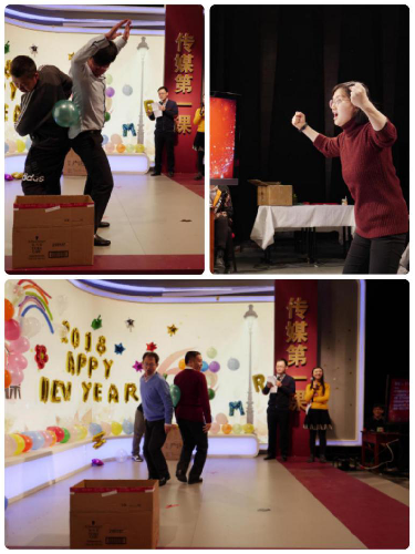 老师一年辛勤付出的感谢和对学院未来的希冀。本次嘉年华通过随机抽签的方式,将老师们随机分为四个团队。每个团队为一个游戏单位,共同参与了流金岁月、夹气球跑、心有灵犀和表情包大作战等游戏。游戏过程中,老师们欢声笑语不断,在游戏中踊跃参与,比分上你追我赶,激烈异常。游戏过程中,在海外访学交流的任伯杰、吴三军和张蕾三位老师也向学院的老师们发来了视频祝福。学院还对2017年表现突出的团队和个人进行了表彰。在激烈的游戏环节结束后,各团队领取到了学院精心准备的新年礼物,党总支书记付琳为嘉年华进行了总结致辞。随着老师们纷纷上台合影留念,本届嘉年华活动圆满结束。