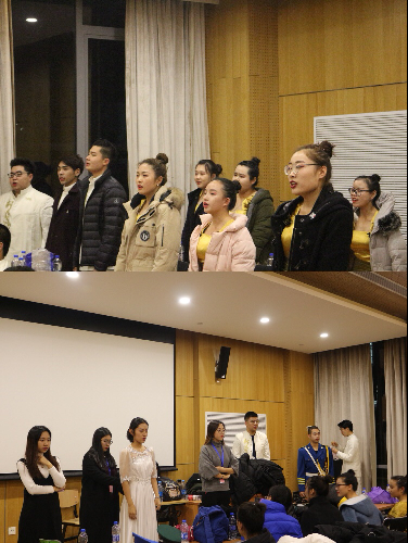 为了庆祝“一二·九”运动八十二周年,文传学院选曲《天耀中华》响应“青春心向党,奋进新时代”的号召,以舞台剧的形式将其诠释出来。经过一个多月的辛苦练习,终于迎来了紧张而又激动的“一二·九”歌咏比赛。比赛开始前,参演人员早早到达备场室准备,认真进行上台前的最后一次合练。