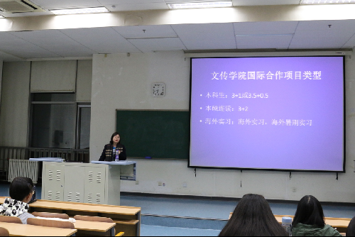 郭媛媛详细介绍了文传学院国际合作项目及相关信息。她具体阐述了学院目前所拥有的国际交流资源和海外实习、海外暑期实习等项目,同时还介绍了美国天普大学、美国新泽西城市大学和英国威斯敏斯特大学三所学校的相关专业信息,分别说明了每所学校的优势和特点,并将参加国际交流项目必备的条件告知给在场学生。郭媛媛还表示,首经贸正处于飞速上升时期,将有越来越多的机会与世界知名大学合作开展交流,同时学校也一直致力于为学生提供更多更好的出国深造机会而不懈努力。她希望学生能自主积极留意相关信息,为自己的未来提前做好规划。
