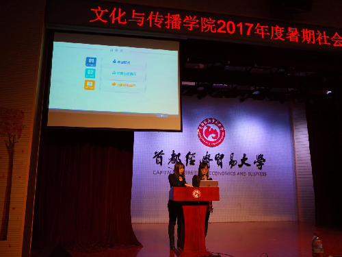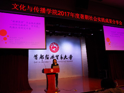接下来是由欧阳熙同学展示的“‘旅游扶贫’机制完善调研”团队。该团队采用分散调研法,队员分别前往北京、吉林、湖南、湖北、河北等地进行了大量的实地调研工作。汇报过程中,欧阳熙着重谈到了整体实践活动带给他们的反思和收获,真诚的分享自己的经验和教训,给在场观众带来了启发。该团队最终获得了三等奖。