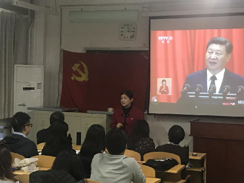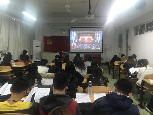 2017年10月18日上午九时,中国共产党第十九次全国代表大会在在人民大会堂正式开幕,中共中央总书记习近平代表第十八届中央委员会向党的十九大作报告。中午十二点半,文传学院党总支书记付琳、老王磁力 党总支副书记、院长石刚、各教师党支部书记,部分教师党员带领全体学生党员和入党积极分子一起观看了十九大开幕会录播,师生党员认真学习党的十九大会议精神。付琳也代表党总支部对下一阶段开展十九大报告的理论学习研讨工作进行了部署和要求。