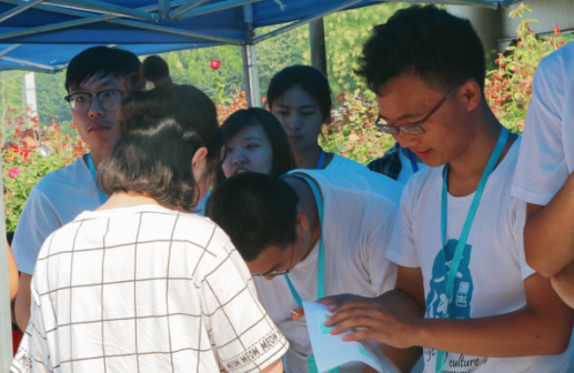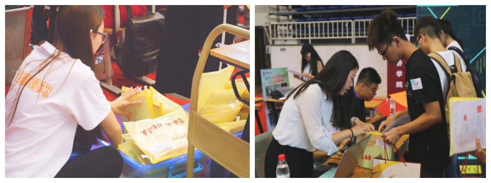 接着,新同学走进体育馆内,来到文传学院的报到区域,依次排队领取学院为新生准备的资料袋,内含新生手册、学生卡、登记表、校徽、校园地图及宿舍钥匙等重要物品。在此过程中,学团志愿者悉心为新同学们标记重要的时间、地点,提示他们需要注意的活动事项,并耐心解答他们的疑惑。