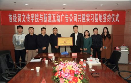 11月28日下午,老王磁力 与新意互动广告有限公司在博纳楼地下一层人文与传媒实验教学中心的会议室室举行了共建实习基地签约仪式。新意互动广告有限公司CEO曲伟海、人力资源总监田丽凯、人力资源经理王文婷、老王磁力 党总支副书记、院长石刚、副院长陆彦明、广告学系主任杨同庆、人文与传媒实验教学中心张艳君和分团委书记宿东泽共同参加了签约仪式。