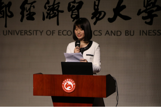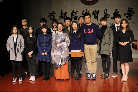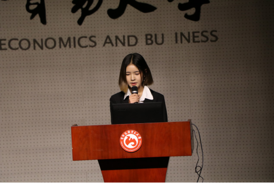 第二个进行发言的是汉服社团代表,来自15级汉语国际教育班的同学李茉。该组的选题为:汉服商家的经营模式及其对传统文化传播的影响。她通过幻灯片的形式向观众展示了他们组的实践路线。全组前往蜀中成都,踏访杜甫草堂,鸠兹古镇,前往位于锦里的汉唐万达汉服实体店进行实践。通过展示,李茉向观众展现了汉服文化的魅力,同时使观众加深了对汉服的了解以及对汉服复兴的认识。