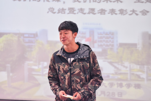 志愿者岗位有台前,当然也有幕后,无论台前幕,没有他们的共同努力,定无法完成如此艰巨的任务。2016级的姚玉代表各幕后岗位志愿者发言,他表示在此次活动中有很多的收获,感受到了一种专属于首经贸的情怀,他向各位志愿者呼吁“纵使若干年后我已步履蹒跚,但你(首经贸)的寿辰我定会到场”。