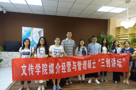 “三创讲堂,只为你的杰出!”传媒专业需与行业有更好对接,媒介经营与管理硕士研究生的培养,也需要不断加强专业实践能力的提高。虽然文传学院首届媒介经营与管理硕士生人数不多,但硕士点如何建设、硕士生如何培养,不仅需要体系、机制的完善,还需要特色、方法的寻找、建立。“走出去”, 延伸课堂,把与行业保持零距离互动的“三创讲堂”开设至行业一线,以实现同学们在实地考察、亲身体验中与产、学、研界及政府机构精英人士对话,这不仅有利于专业特色氛围的营造,有定位、有特色地进行媒介经营与管理专业人才的培养,还是文传学院做好硕士点建设,促进学科更好发展的有力尝试、一大举措。