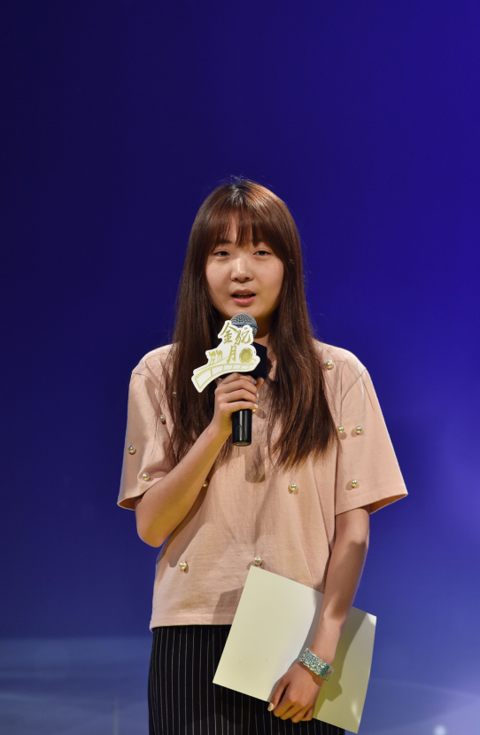 接下来进行的是颁奖环节。对金驼月每个活动项目颁奖前,都包含一个对该活动内容精彩片段进行回放的短视频,嘉宾观赏完视频后,走上颁奖台为获奖者颁奖。首先表彰的是文传大讲堂活动。文传大讲堂是今年金驼月新开设的活动,它因筹划周密、内容丰富而广受好评。为此学院特对活动运营团队颁发“金驼月社会服务突出贡献奖”,以示表彰。广告学系主任杨同庆为文传大讲堂运营团队颁奖。文传大讲堂负责人刘骏晟老师对学院领导的支持和运营团队的学生负责人表示感谢。