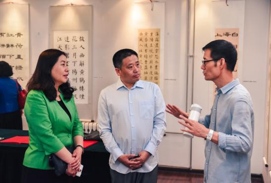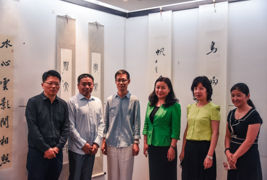 参加揭牌仪式的领导和老师在书法体验室合影留念