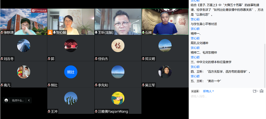 在传播学系主任贺心颖的主持下,传媒学术吧拉开了帷幕。主讲嘉宾王昕围绕“大思政课”的教学思维和教学方式,结合本学期期末电影课的视频辅导方式,就如何探索艺术教育与国学教育的结合之道进行了讲解与分享。在讲解的过程中,王昕从思路、方法、精神三个层次,结合自己近年来在艺术和国学方面的教研心得,对于周孔文化精神、毛泽东精神、中华文化的根本特征、关于“中国有无哲学”的争论、中国美哲学等概念和观点做了深入浅出的剖析与解读。