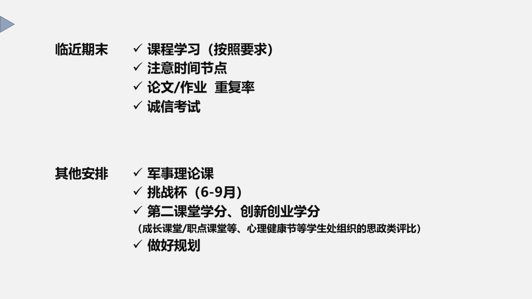 随后,高琼通过PPT直观、明了地向同学们梳理了大家在日常学习生活中进行的各项工作、活动的时间线以及注意事项,并叮嘱大家临近期末,同学们需要在复习计划、考试安排以及考风考纪上提高认识,认真对待。此外,特别提醒大家在疫情期间,做好个人防护,严格遵守属地疫情防控要求,落实“四方责任”中的个人责任,充分理解和贯彻“动态清零”政策,配合属地和学校做好疫情防控相关工作。