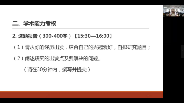 专硕组考核。王水老师担任专硕组考核组长,李荃、孙晔、刘念、谭宇菲、戴新月担任评委。老师们在博远楼六号会议室线下集中进行考核。上午专硕组进行综合能力考核,营员们通过自我介绍、热点事件分析等方式展示自己的综合能力。