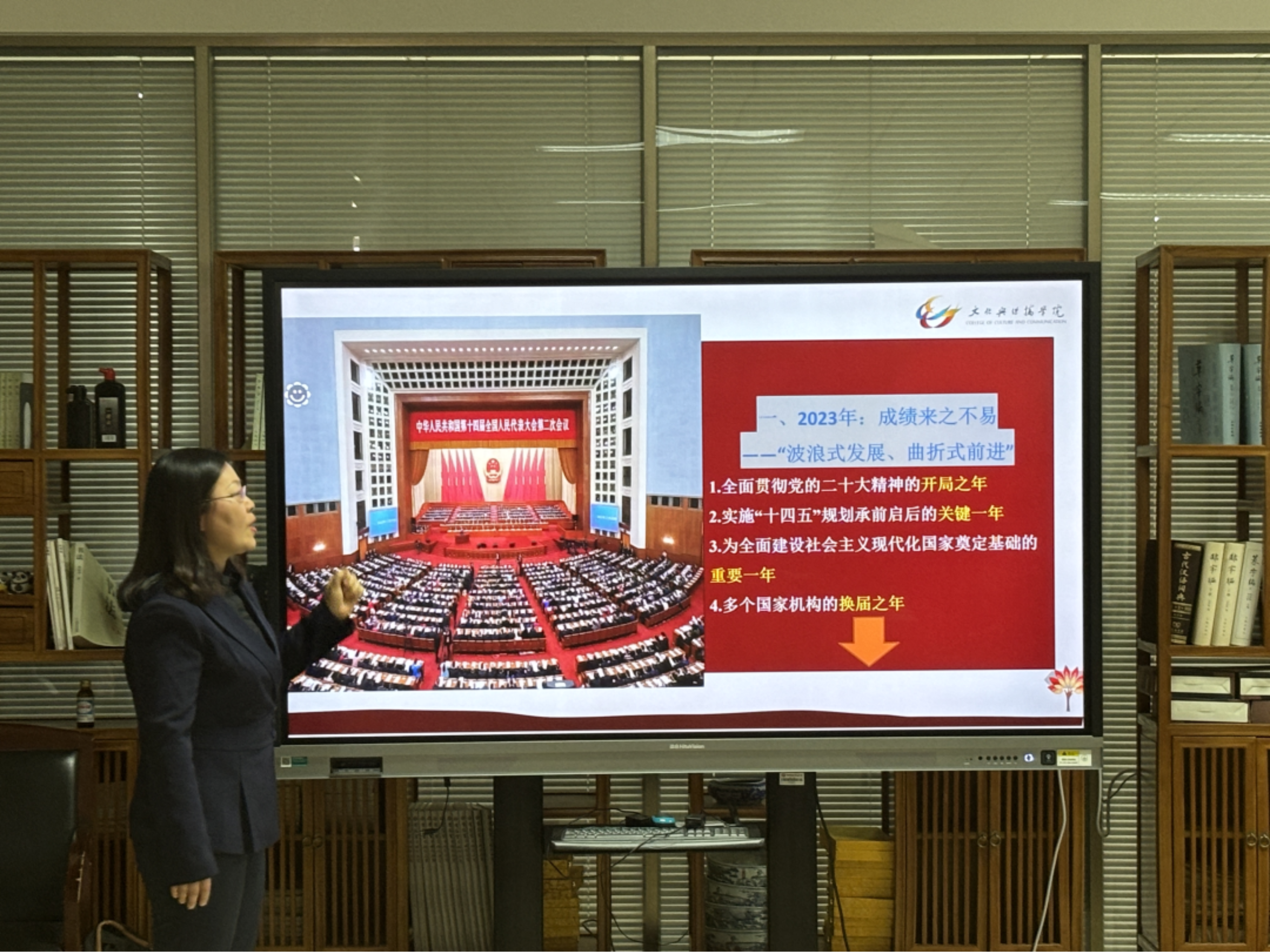 以“2023年:‘来之不易’——‘波浪式发展、曲折式前进’”、“2024:‘稳中求进’——‘质的有效提升、量的合理增长’”、“关键词:‘新质生产力’”、“如何作为:‘站上去’、‘走进去’、‘坐下来’”四个部分,郭媛媛分享对今年两会精神的体会与认识。
