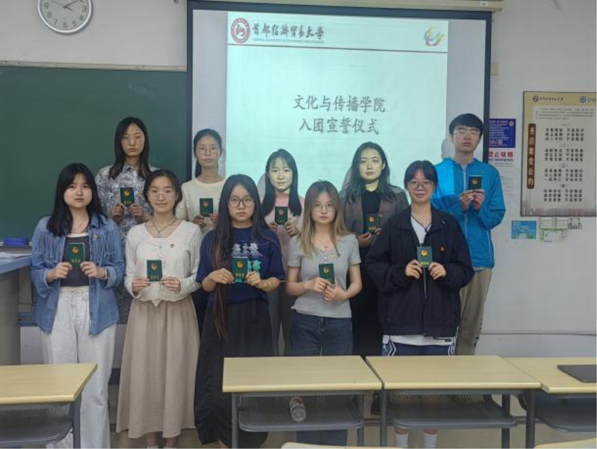 在庄严肃穆的国歌声中,入团宣誓仪式正式开启。全体人员起立,齐声高唱中华人民共和国国歌。随后,组织部部长韩璐仪宣布吕沐、吴可菲等十位同学成为新发展团员,这是他们青春道路上的重要一步,并向这十位新团员表示热烈的祝贺。