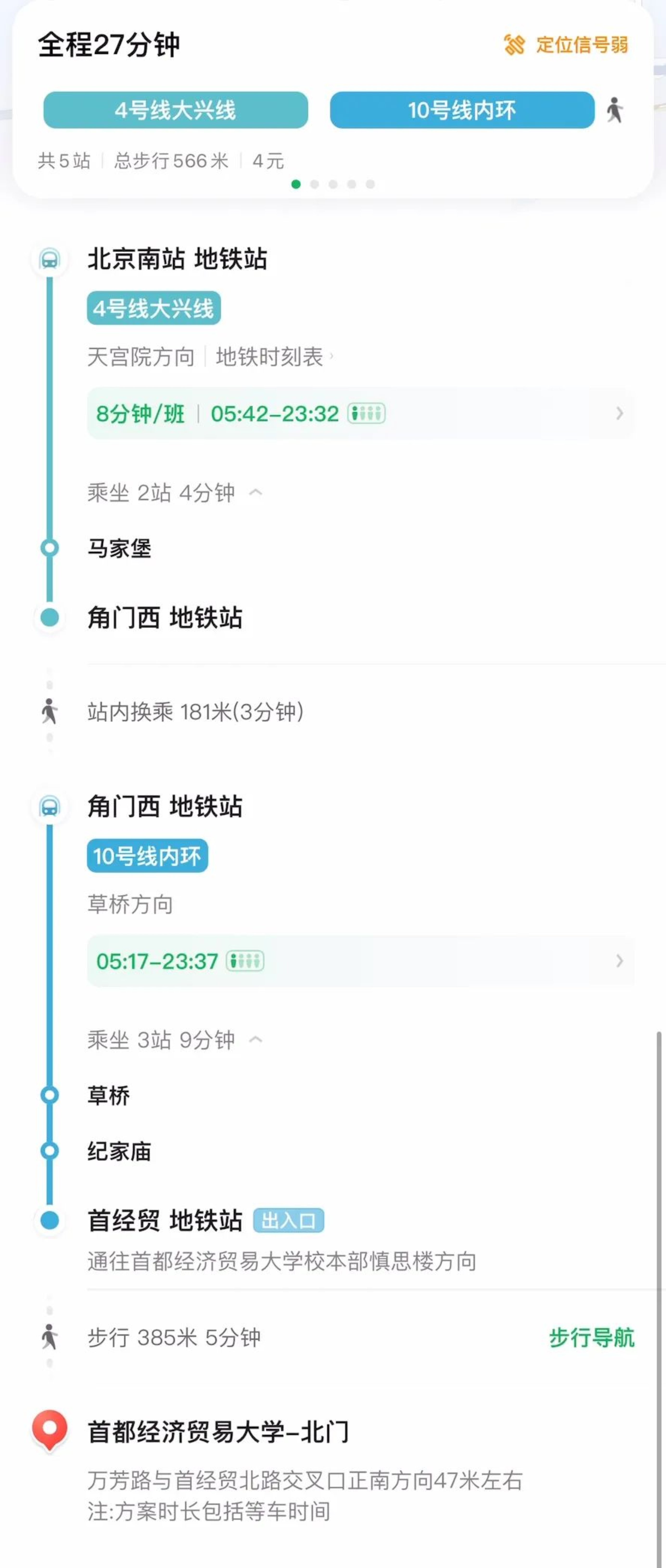 地铁:乘坐4号线—角门西站换成10号线(草桥方向)—首经贸站(D口出到达学校北门/C口出到达塞欧公寓)大约25分钟到达