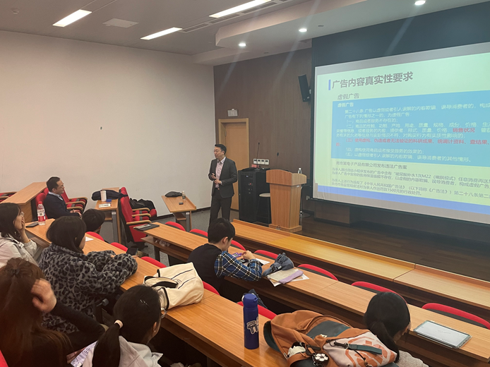 席旸从为什么需要掌握广告法、广告法概述与广告内容规范审查、新兴业态的广告法适用三方面展开分享。他强调广告法是从业底线,详解了广告法的定义、目的及适用范围,重点解读真实性、合法性两大原则,并以亲身代理的案件为同学们进行了讲解。
