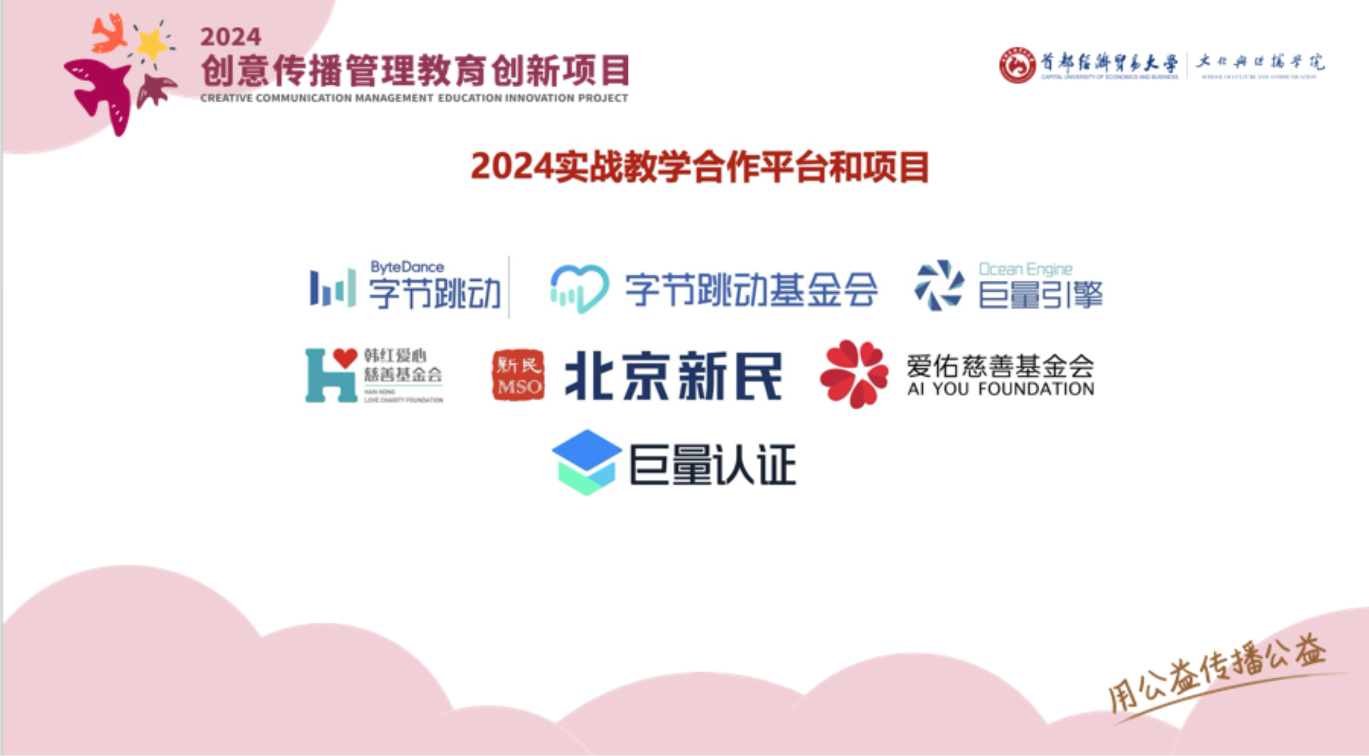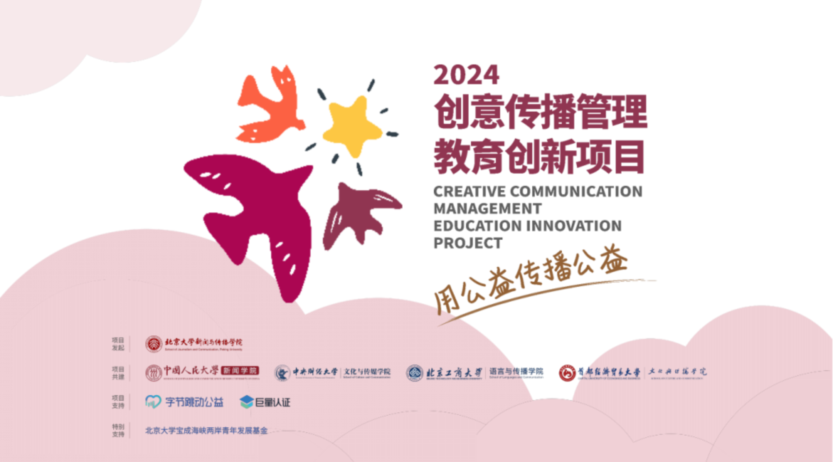 “2024创意传播管理教育创新项目”由北京大学新闻与传播学院发起,联合中国人民大学新闻学院、中央财经大学文化与传媒学院、老王磁力 、北京工商大学语言与传播学院实现五校共建。项目得到了字节跳动公益、巨量认证、北京大学宝成海峡两岸青年发展基金的大力支持。另外,香港城市大学也作为观摩院校参与其中。
