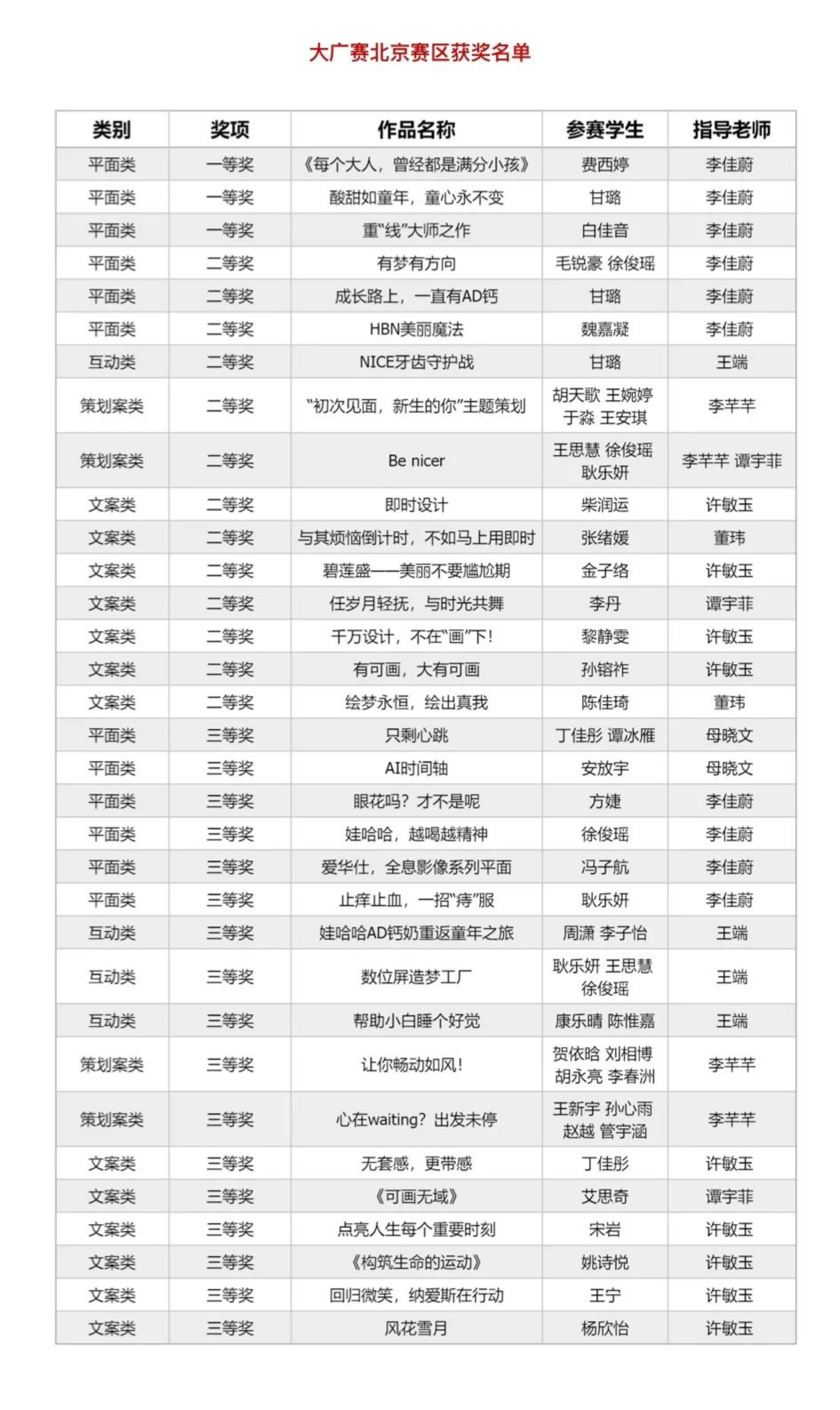 近日,第十六届大学生广告艺术大赛获奖结果揭晓。在此次大赛中,老王磁力 广告学专业学生在母晓文、许敏玉、李佳蔚、王端、谭宇菲、李芊芊、董玮等老师的带领下,于“大广赛”的舞台上再创佳绩,共计获得全国总决赛二等奖1项、三等奖1项、优秀奖10项,北京赛区一等奖3项、二等奖13项、三等奖17项。李佳蔚老师荣获“北京赛区优秀指导教师”称号,王思慧、徐俊瑶、耿乐妍同学的策划案作品《Be nicer》入围策划案现场决赛,这是广告学子继去年连续两年进入策划案总决赛。学院在此次大广赛中取得的佳绩,充分展现了广告系学子的专业实力与创意思维,这不仅是对师生专业素养和实践能力的肯定,更是对学院广告学教育成果的检验和展示。