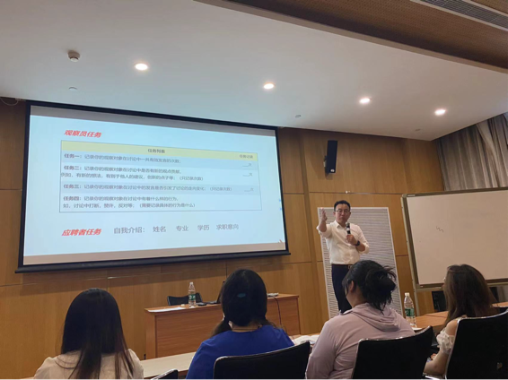 随后,白云带着同学们模拟了一次无领导小组讨论。他让七位同学模拟应聘者,其他所有在座者作为观察者。同学们纷纷积极参与、互动。