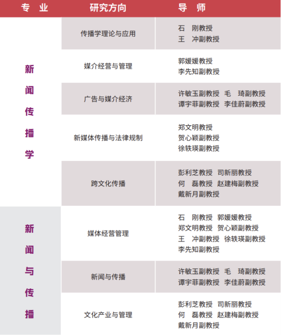 以马克思主义新闻观为指导,本专业为我国新闻传播事业和产业培养德才兼备,具有现代传播理念与国际化视野,了解中国基本国情,能从事传播理论与应用、广告学与媒介经济、媒介经营与管理、新媒体传播与法律规制、跨文化传播等理论、实践研究的高级专门人才。